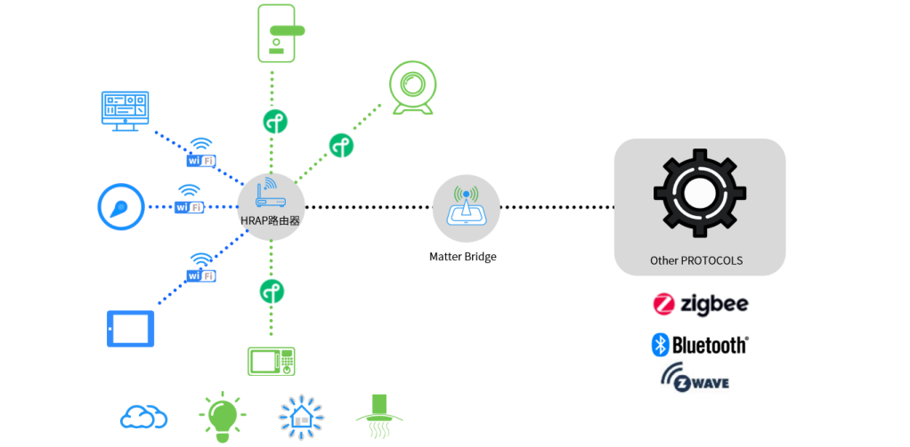 Matter协议基于IP架构,仅定义应用层标准,主要依赖支持IPv6的网络层和传输层进行数据传输。在此IP架构下,Matter网络无需额外网关或专有协议即可完美兼容Wi-Fi(高带宽)、Thread(低功耗网状网络)与以太网等IP协议,实现设备间的本地化互联。此外,Matter网络还可通过Matter Bridge桥接Zigbee、Z-Wave与蓝牙等非IP协议。