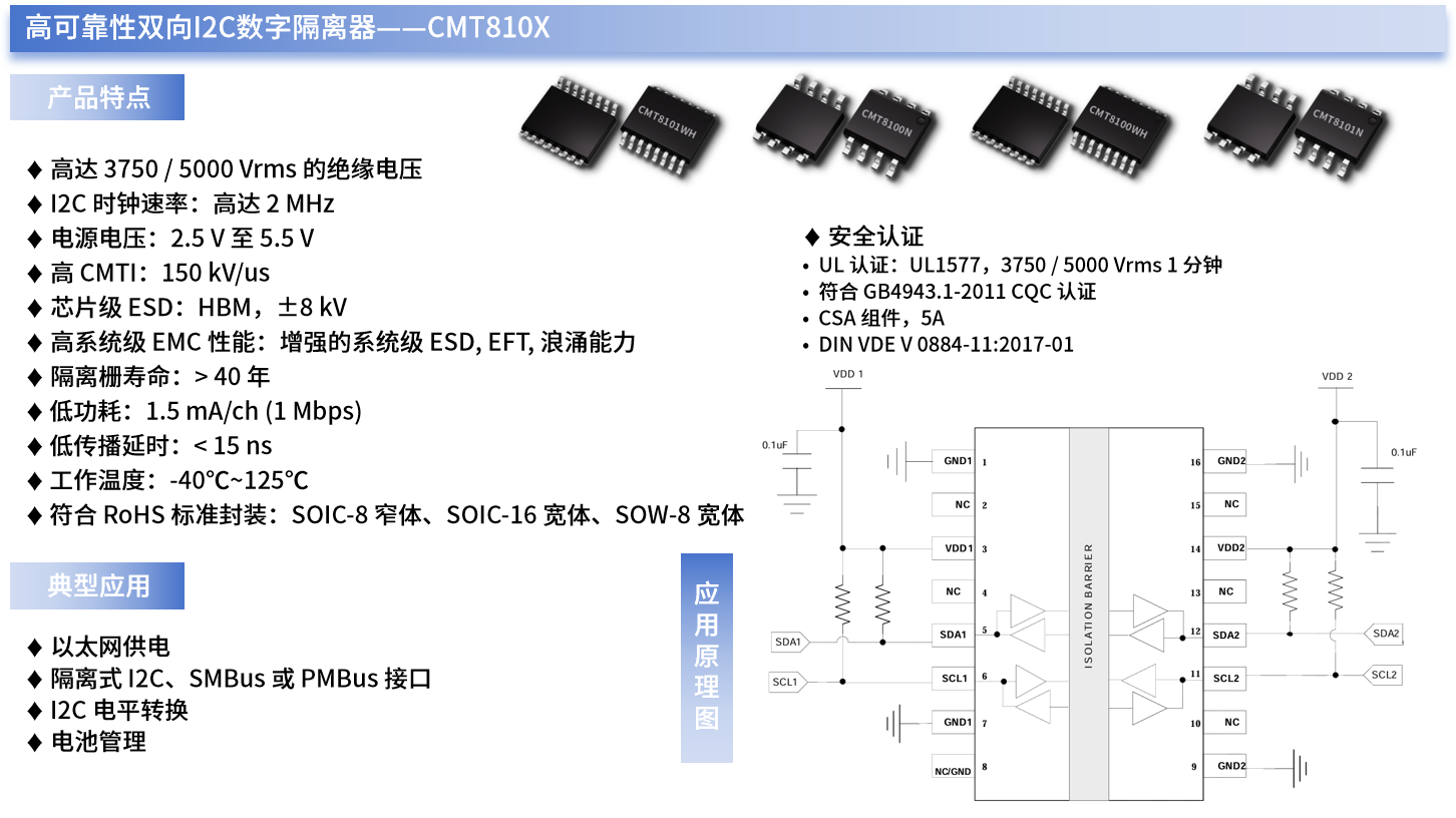 CMT810x系列I2C数字隔离器为符合AEC-Q100 标准,UL1577安规,支持多种电气隔离耐压(3.75 kVrms、5 kVrms);同时能在低功耗条件下提供高电磁抗扰度和低辐射的性能。