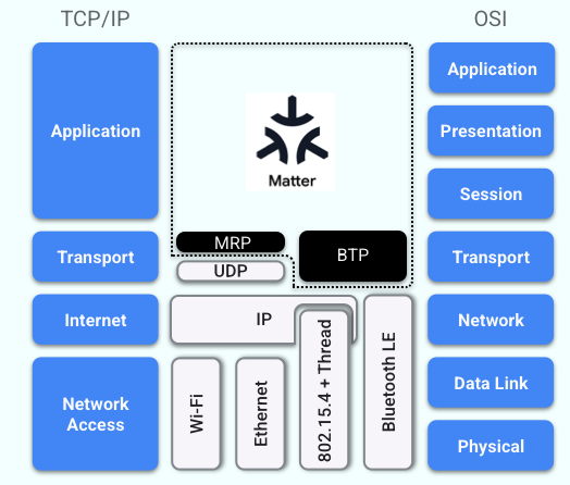 据官方资料显示,Matter标准的核心协议对应着OSI(Open System Interconnect)开放系统互连参考模型中的最高层(第5层~第7层),这意味着它能在任何类型的IPv6传输层与网络层之上运行,可无缝兼容Wi-Fi、以太网、Thread与BLE(通常用于设备配网)等底层协议。