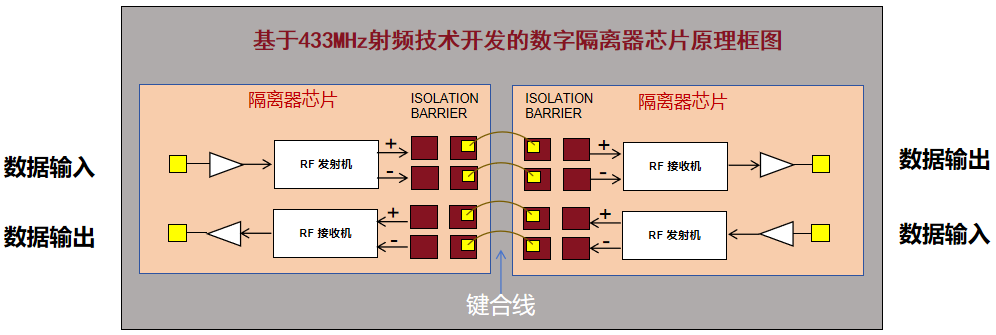 所谓数字隔离器,实际上就是在一颗芯片两侧实现的一个微型无线射频收发系统。在此系统中,射频发射端将要传输的数据信号通过OOK调制为高频脉冲信号,而后在电容电场的耦合作用下,高频脉冲信号耦合至射频接收端,并通过OOK解调为初始的数据信号,从而在电气隔离环境中完成数据信号的有效传输。